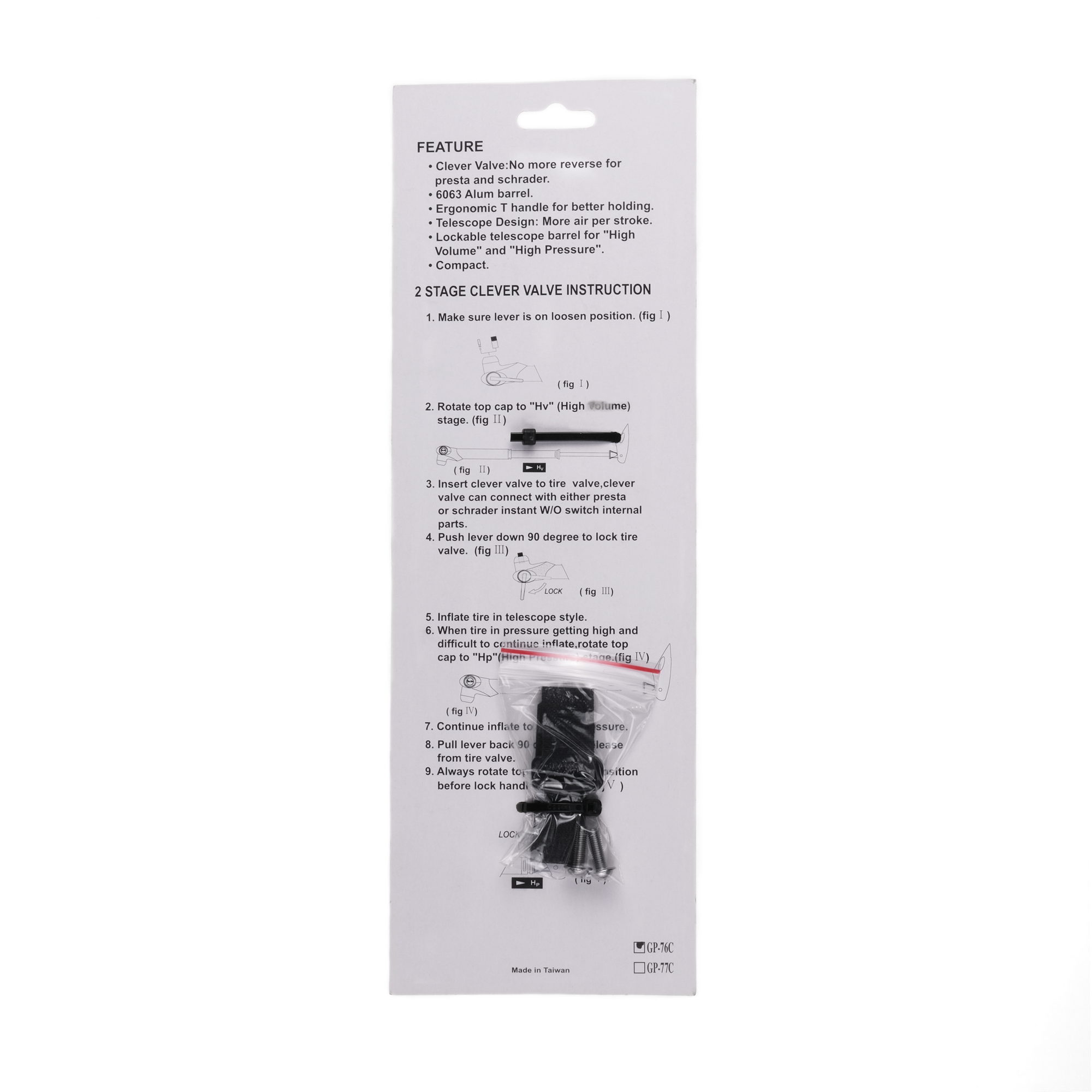 Насос имеет двусторонний клапан Presta/Schrader и линейный манометр.