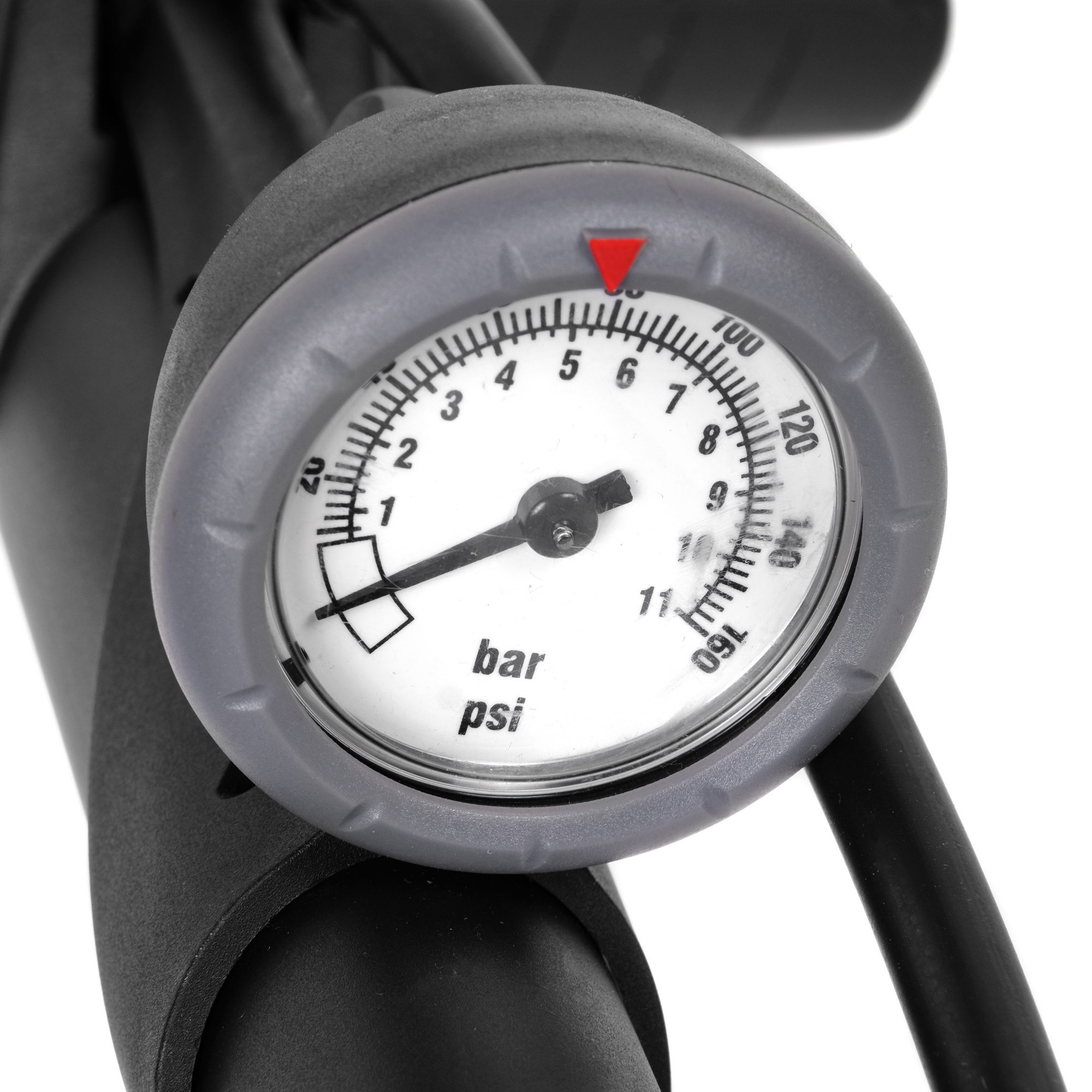 Стальной цилиндр увеличенного размера способен накачать колёса до давления 2 бар (30 psi). Точность давления контролируется манометром на пластиковой базе.
