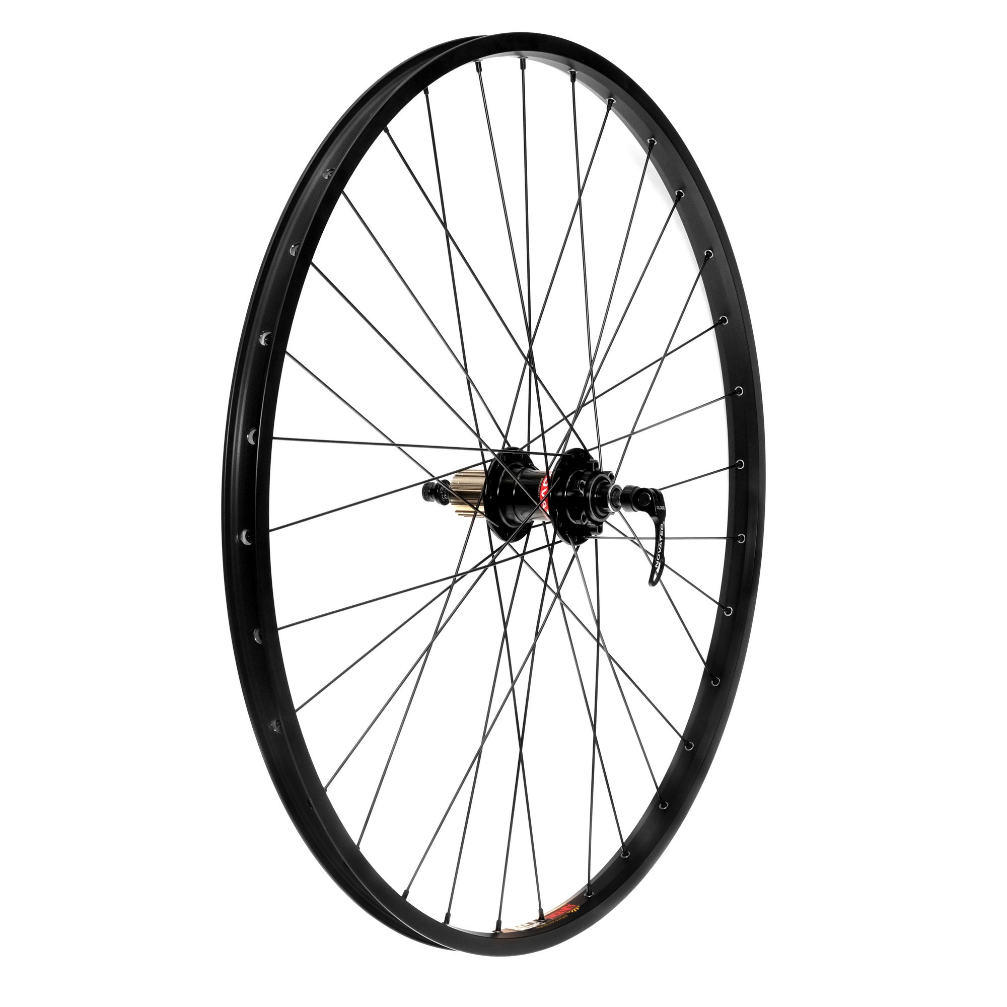 Заднее колесо для MTB 26", собранное на задней втулке Novatec 762 на 2 промышленых подшипниках, черных спицах Richman 262mm, черных ниппелях 12mm и ободе Alex DH-25 32H.