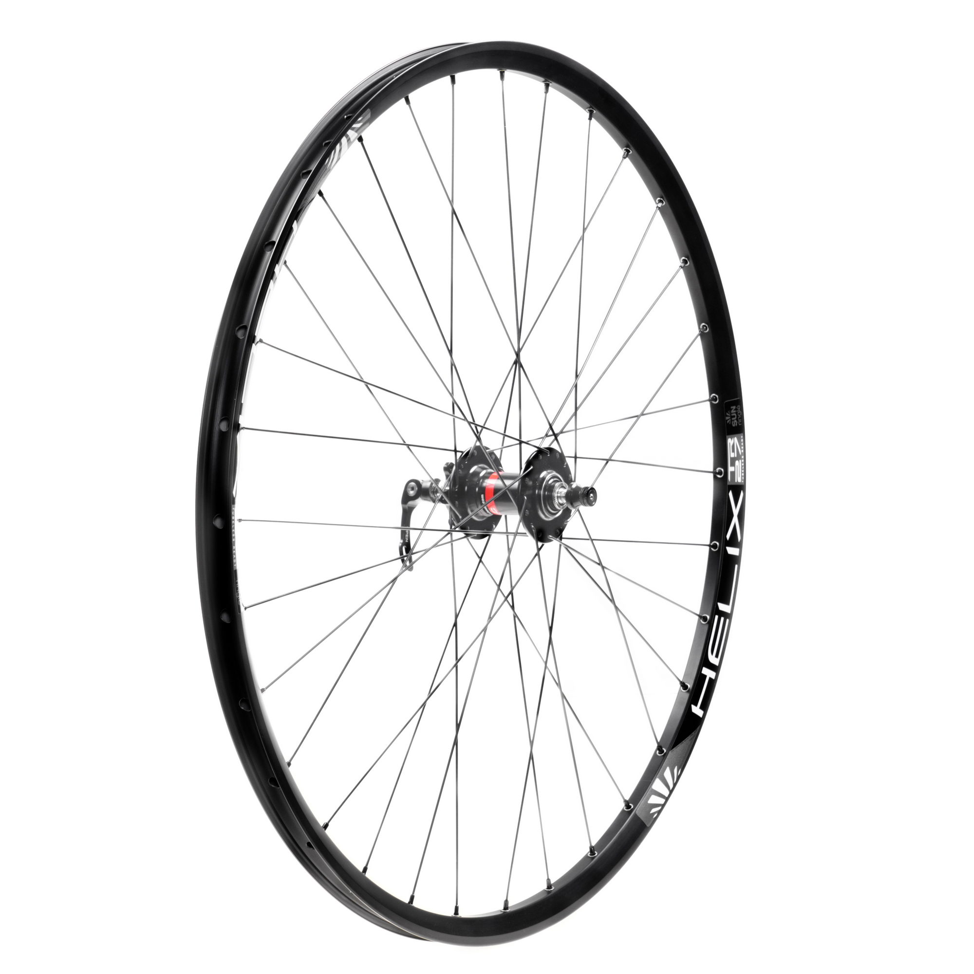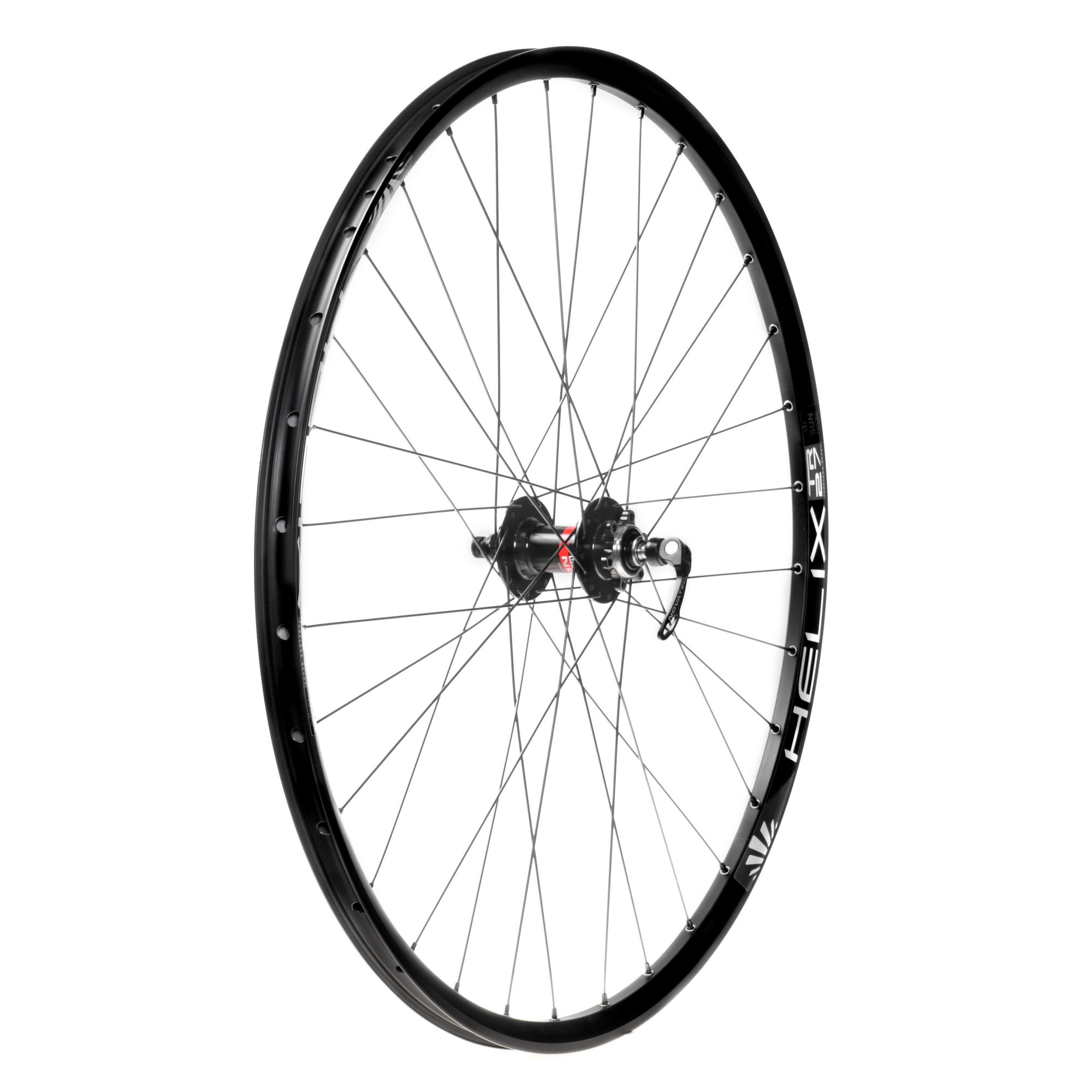 Заднее колесо для MTB 29", собранное на втулке Novatec D042-SB 135mm на 4 промышленных подшипниках под эксцентрик, черных спицах Richman 292/294mm 2.0mm, черных латунных ниппелях Richman 12mm и ободе Sunringle Helix-TR27.
